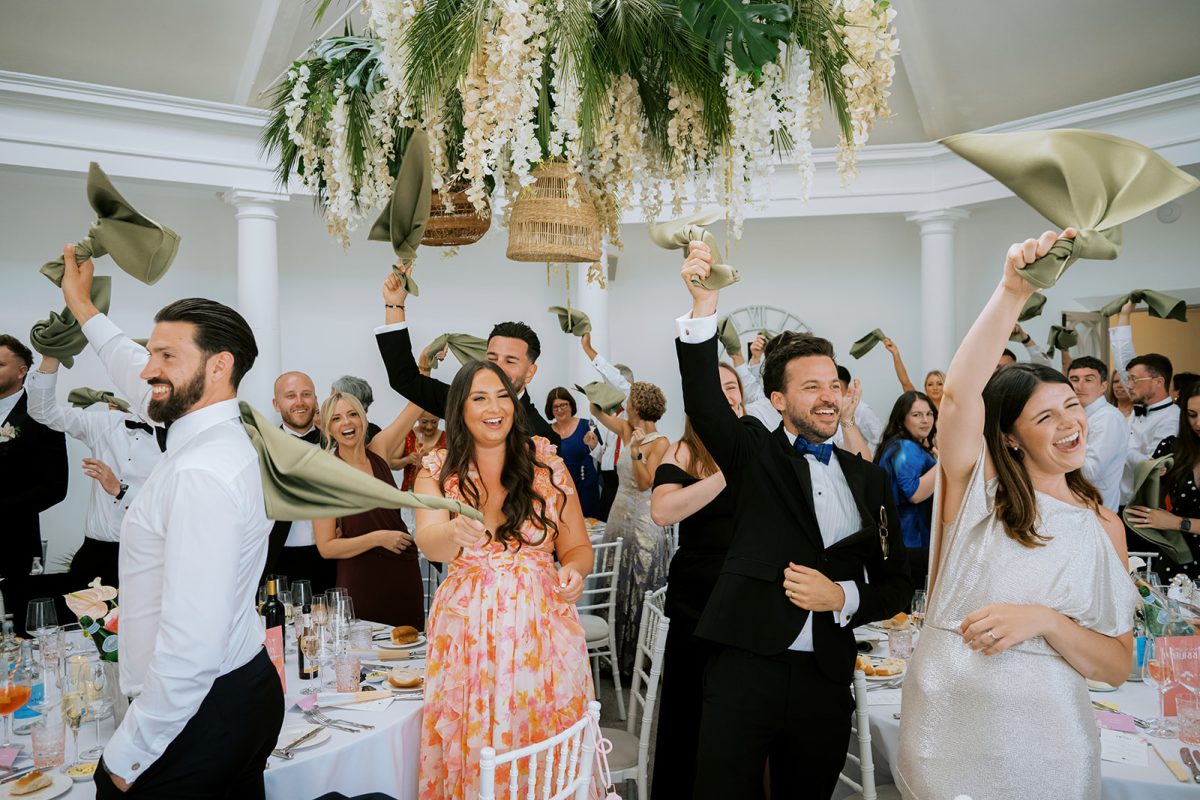 The orangery offers a beautiful setting for the wedding breakfast, with sweeping views across the manicured grounds and out to sea. Lauren & Will chose long tables to welcome their guests, styled with a timeless pink floral palette that perfectly complemented the space.