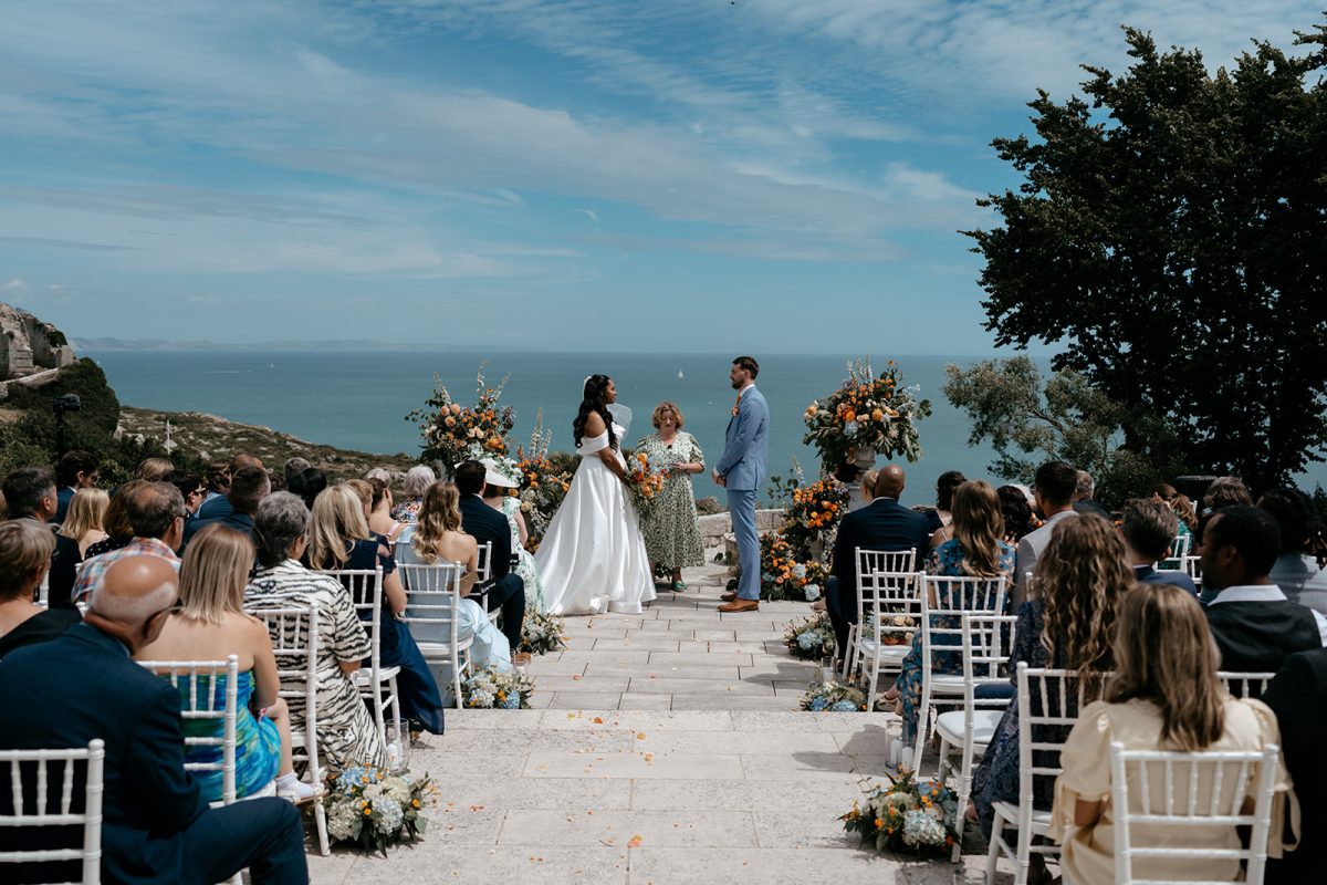 Choose from an indoor ceremony in the beautiful Orangery, with large french windows leading out onto the terrace. Or take your ceremony outdoors to the Pagoda, situated on our sweeping lawn with dramatic sea views, the Olive Garden with its exquisitely manicured planting and more secluded feeling, or the Roof Terrace at Clifftops with one of the best views of the channel, and looking back up to the Castle.